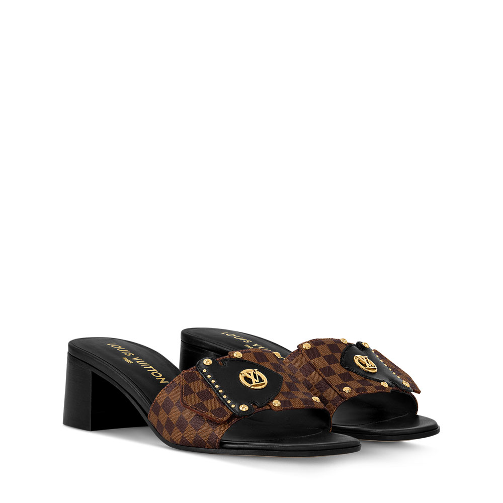 Explore the Louis Vuitton LV Frame Mule, featuring timeless Damier canvas for an elegant look. The standout detail is its strap, inspired by the Camera Box bag, paired with gold studs and the LV Circle logo.