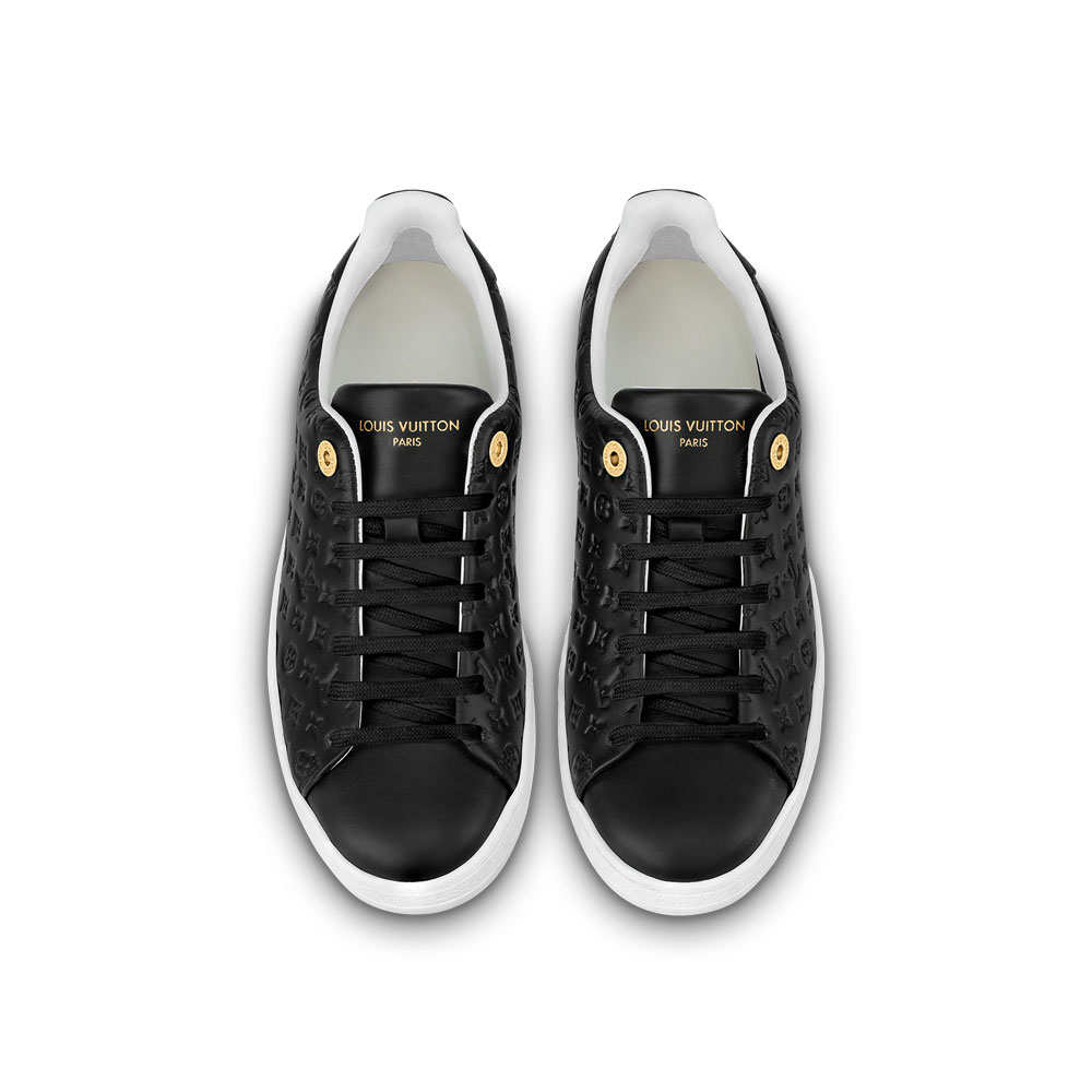 The emblematic Frontrow sneaker is revisited this season in soft calf leather. which debossed with the iconic Monogram pattern. This sleek. timeless design is elevated by refined details. including engraved. gold-tone eyelets and a Louis Vuitton signature on the rubber outsole. A padded insole provides extra comfort.