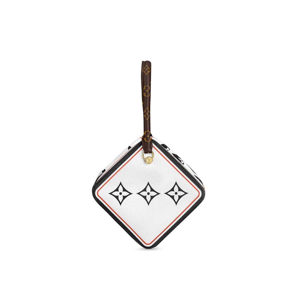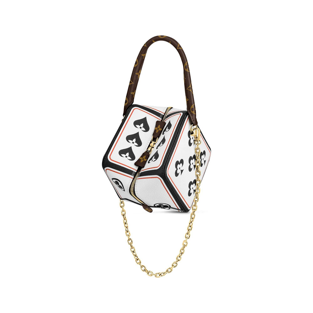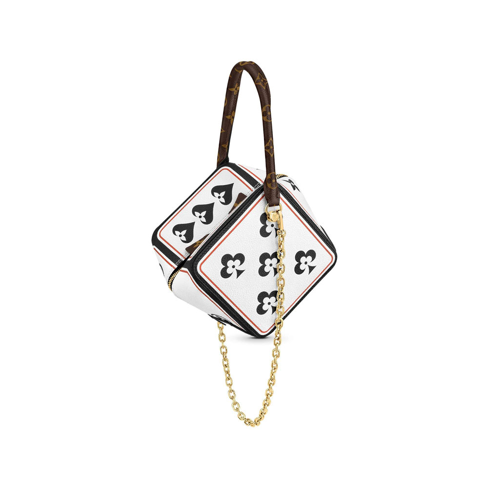Nicolas Ghesquiere introduces the limited edition Square Bag for Cruise 2021. Like an oversized dice. this leather handbag is decorated with symbols representing playing card suits crossed with Monogram Flowers. It can be carried by hand with its Toron handle or on the shoulder thanks to a removable gold-color chain.