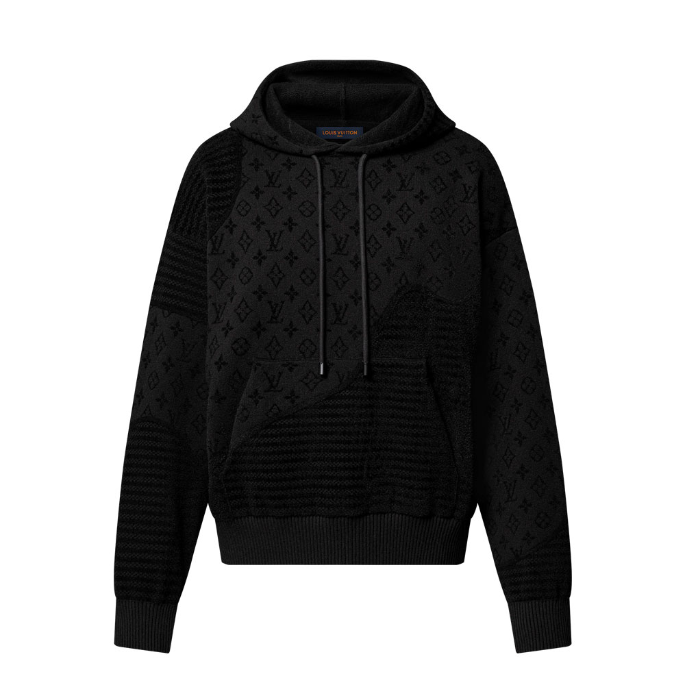 Louis Vuitton Graphic Jacquard Hoodie in Black offers versatile styling for modern menswear. Pair it with slim-fit black joggers or distressed dark denim to amplify its textured stripes. Layer a tailored leather bomber jacket for edgy contrast, or opt for a minimalist oversized trench coat to align with the SS25 adventure theme.
