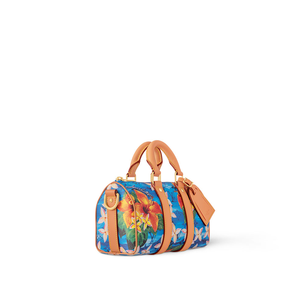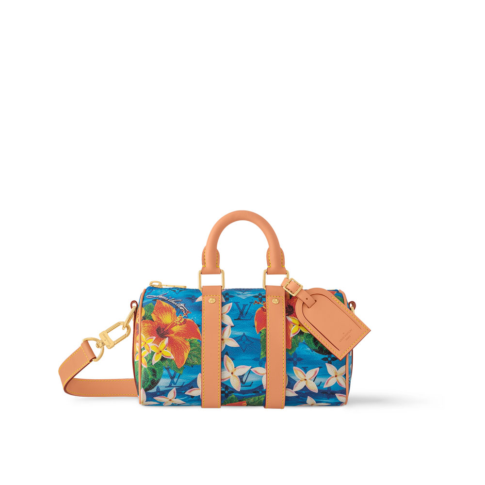 The Keepall Bandouliere 25 bag is a smaller version of Louis Vuittons famous Keepall travel bag. It is made from Pharrell Williams Monogram Surfin canvas, with its intricate print combining different summery motifs. The bags design and tropical print give this city bag a vintage feel. A detachable strap and two rolled leather top handles enable carry options.