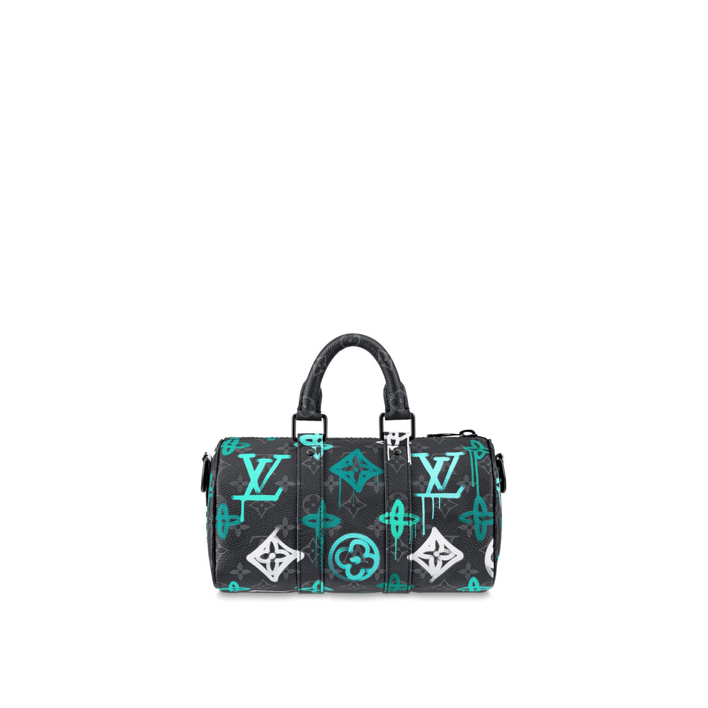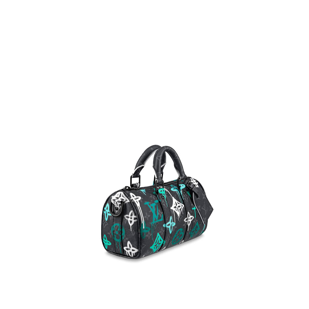The Keepall Bandouliere 25. a small city bag. is made from a street-art version of Monogram Eclipse canvas on which the Monogram motif is worked with a spray-paint feel. Inspired by the House's emblematic Keepall travel bag. it features the same dual side bands and leather name tag.