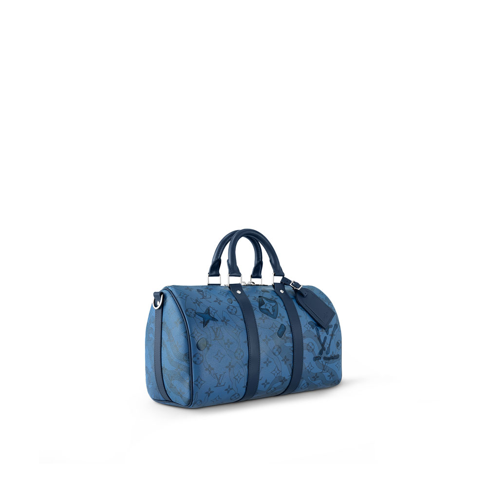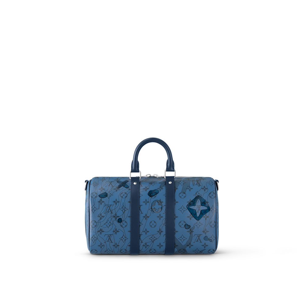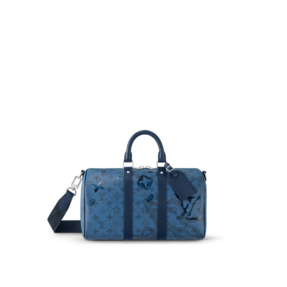 Slightly larger than the City Keepall, the Keepall Bandouliere 35 is fashioned from Monogram Aquagarden canvas, with a three-dimensional water drop effect of Monogram Flowers and LVs. The lateral bands and two rolled-leather top handles evoke the original Keepall travel bag. A practical textile strap, removable and adjustable, enables shoulder and cross-body wear.