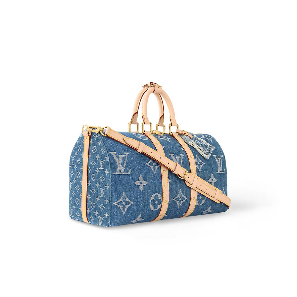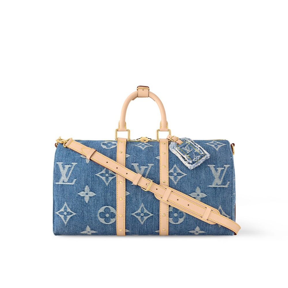 The classic Keepall Bandouliere gets a sporty-chic new look with the Monogram Denim theme. The Houses famous Monogram pattern is printed on certified organic canvas the color of blue jeans, creating an eye-catching contrast with the natural cowhide trim. Complete with a padlock and a removable strap, this spacious bag is ideal as a carry-on or for short trips.