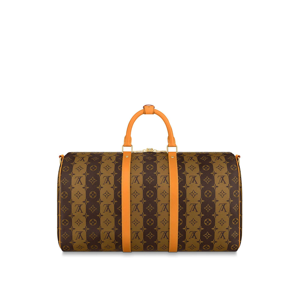 The classic Keepall Bandouliere 50 travel bag gets a makeover under the auspices of Virgil Abloh and Japanese designer Nigo as part of the NIGO x Louis Vuitton capsule collection. Made of Monogram Stripes Brown canvas. With the Monogram pattern on a striped background. It features a wide removable strap with an embroidered Louis Vuitton.