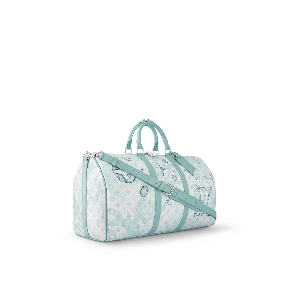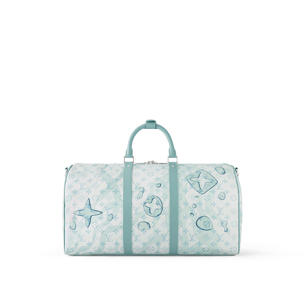 The Keepall Bandouliere 50 bag is made from Monogram Aquagarden canvas, with an aquatic version of Monogram pattern overlaid with surprisingly realistic water-drop renderings of the Monogram Flowers and LVs. The leather lateral bands, top handles, and name tag bring a structured feel to this classic travel bag.
