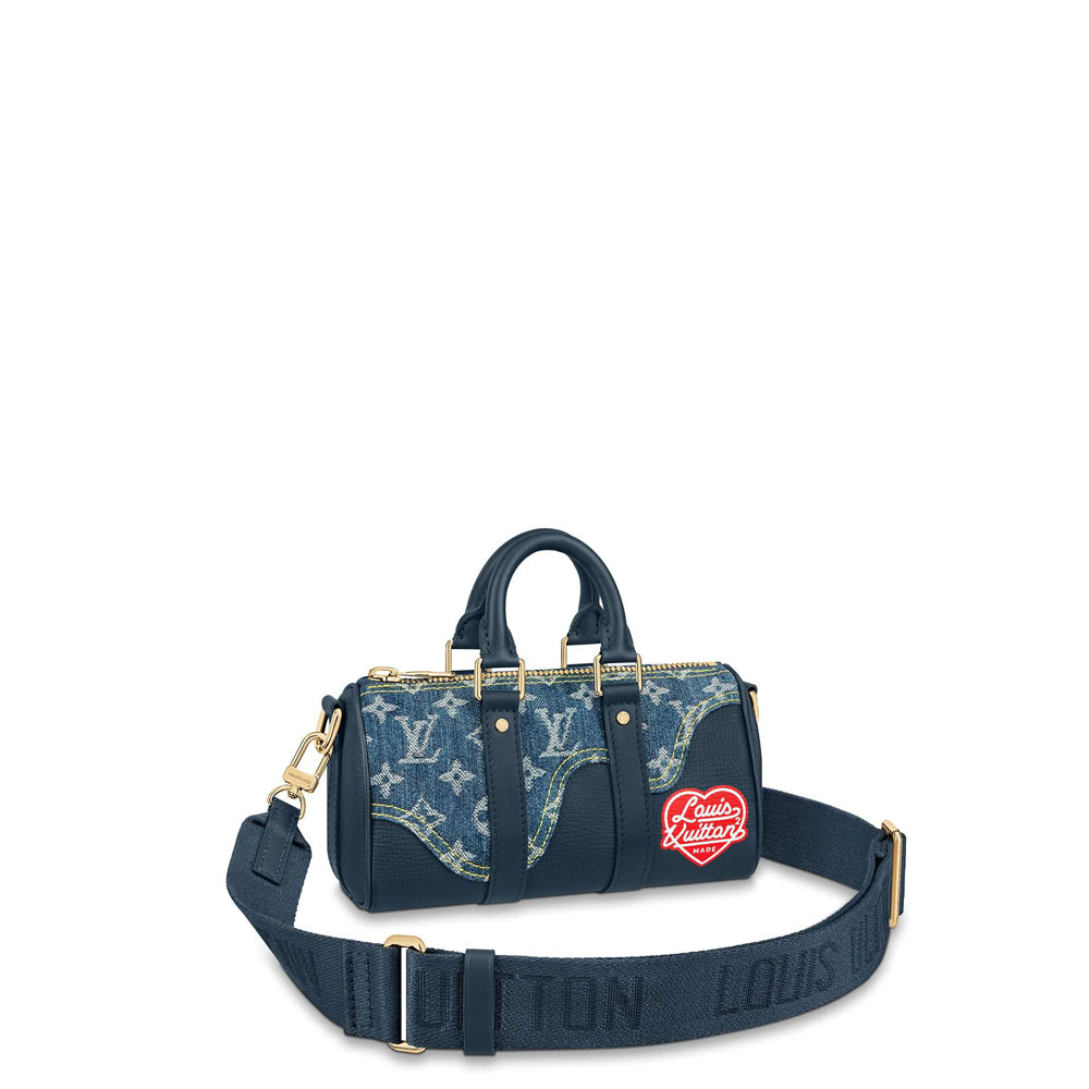The mini version of the classic Keepall comes with an imaginative twist for Pre-Spring 2022: the Monogram Drip look by the Japanese streetwear designer Nigo. Louis Vuitton's historic Monogram pattern on cool blue denim is paired with supple Taurillon leather in elegant navy blue. A vibrant red heart adds a colorful signature to this stylish. practical city bag.