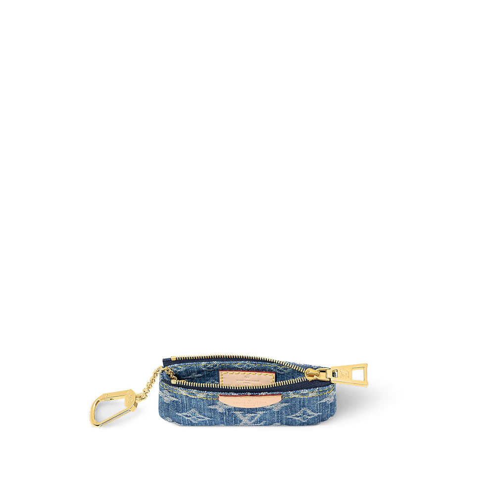 The Key Pouch is made from stone-washed Monogram Denim, with natural cowhide-leather trim and gold-color hardware. In addition to holding keys, it can also be used to securely carry cash and cards thanks to its zip closure. A small hook-and-chain allows it to be attached to a bag or belt.