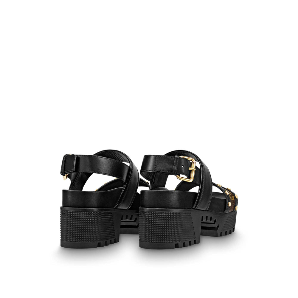Inspired by the iconic Laureate desert boot. the Laureate platform sandal comes in black calf leather with a front strap in patent Monogram canvas. A double row of gold-tone studs referencing historic Louis Vuitton trunks embellishes this on-trend style with its distinctive treaded rubber outsole.