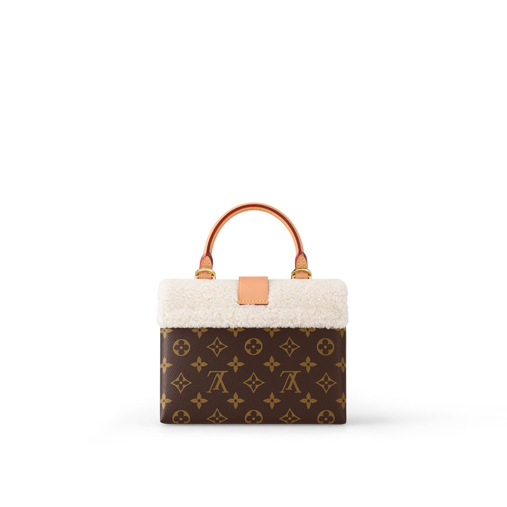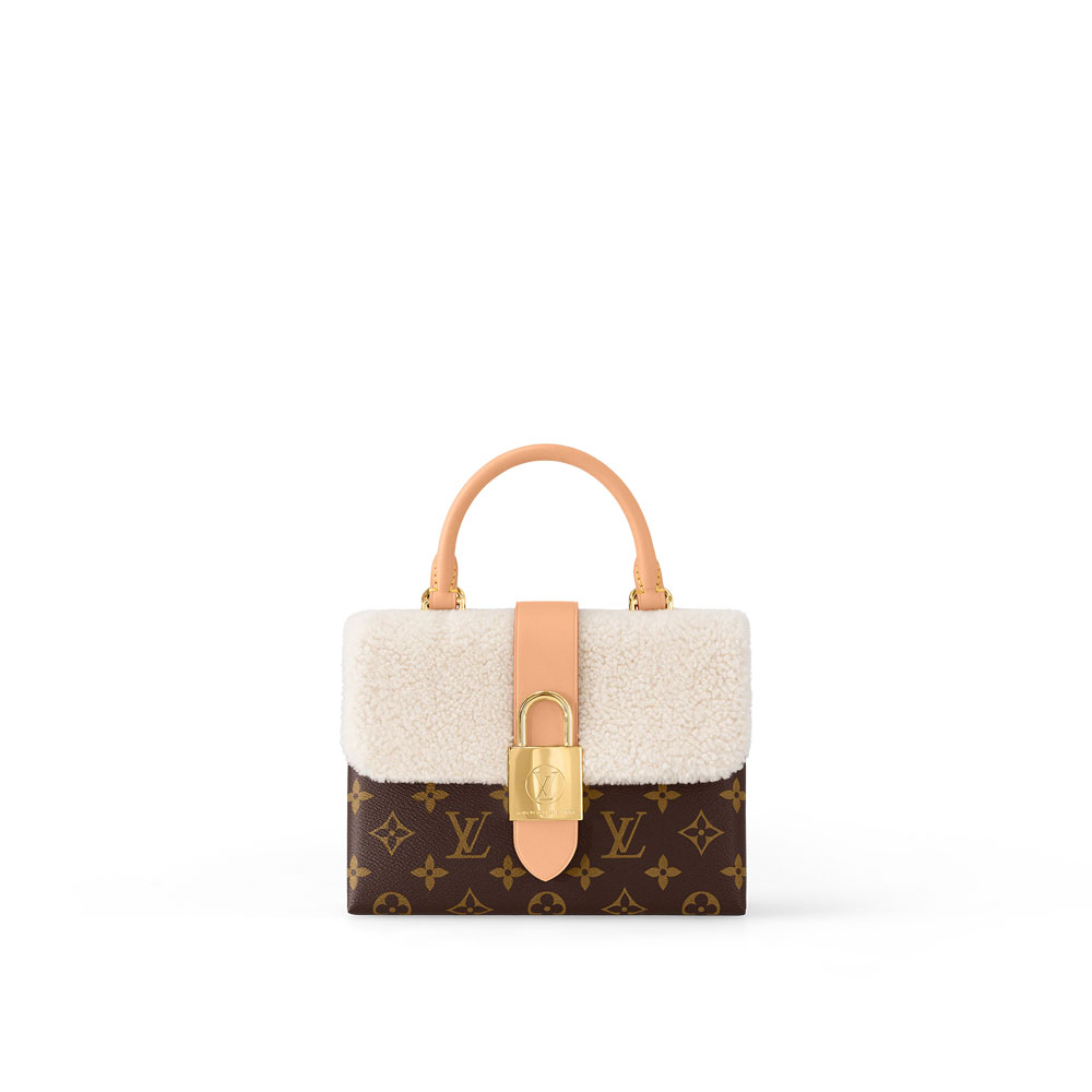 The Cozygram edition of the Locky BB handbag features an eye-catching mix of materials: Monogram canvas combines with soft. cream-colored shearling. accented with an oversized golden padlock. while the top handle and removable strap are crafted from the Maison's natural aged leather. This day-to-evening piece can be styled in a number of ways. from hand carry to cross-body wear.