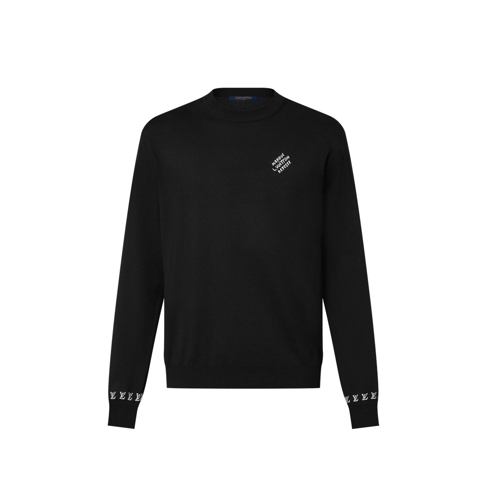 Louis Vuitton Long-Sleeved Cotton Crewneck in Black 1AGKMH offers versatile styling for modern menswear. Pair this sleek black knitwear with tailored dark jeans and minimalist leather sneakers for a refined casual look. Layer it over a crisp white tee, allowing the textured jacquard chest detailing to stand out.