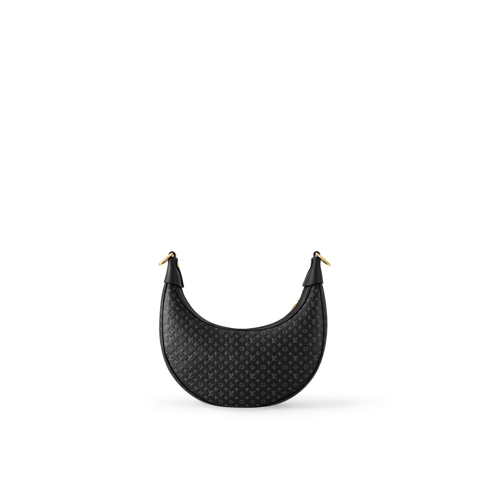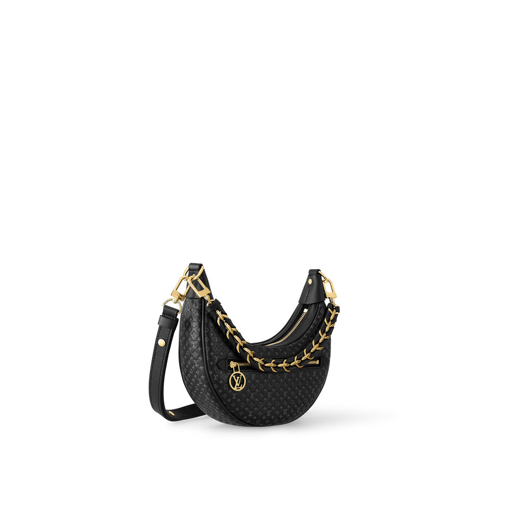 The Loop baguette handbag is fashioned from calfskin with a nano version of the Monogram embossed into the leather. The colored silk-screened LVs and Monogram Flowers contrast subtly with the base. The bag is accented with gold finish on the chain and the emblematic LV Circle zip pull.