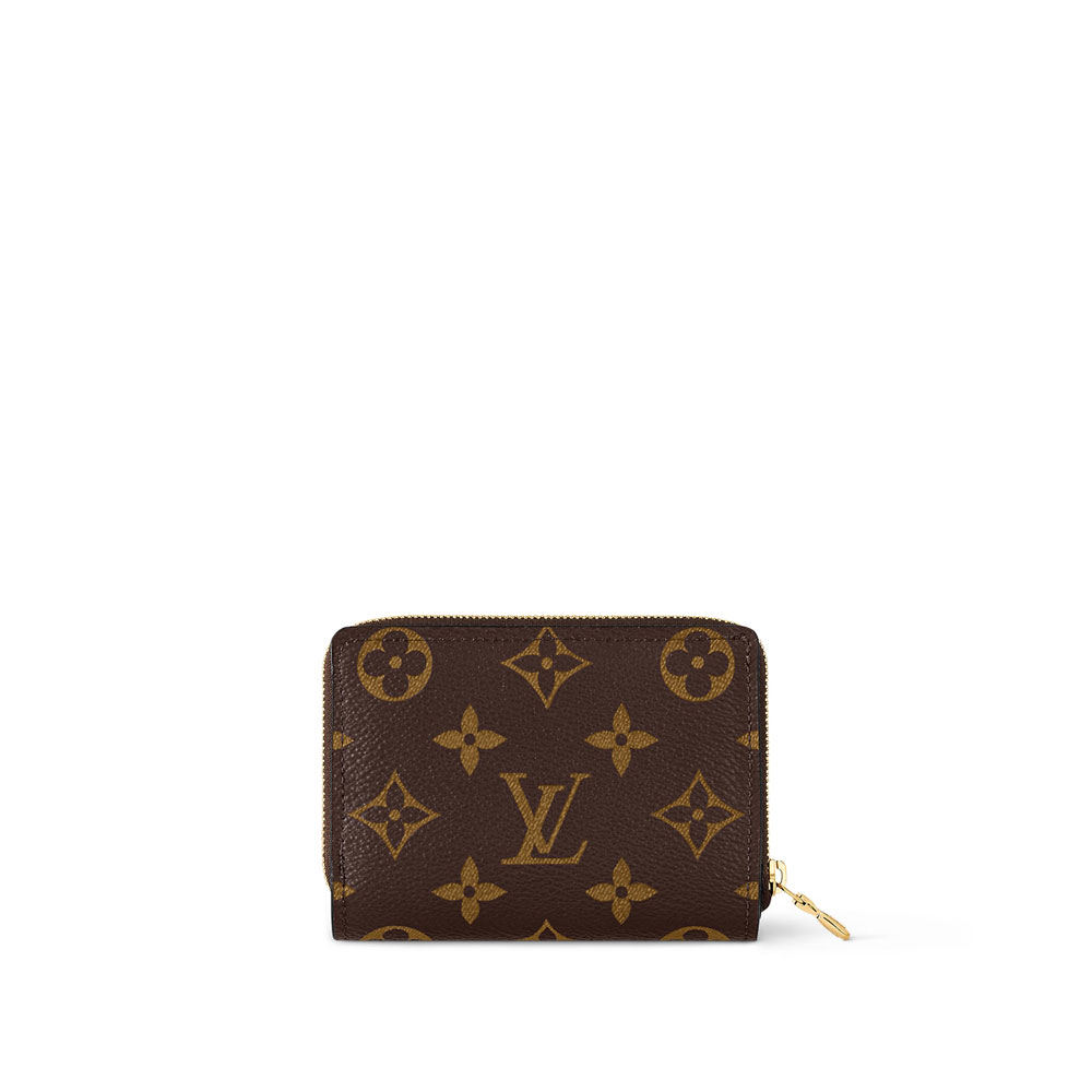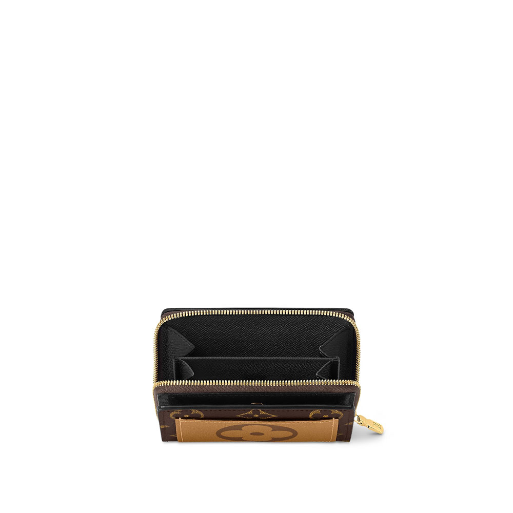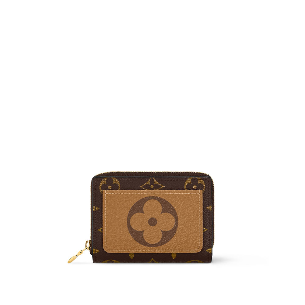 The Lou wallet comes in Monogram canvas, with a contrasting front pocket featuring a Monogram Flower in Monogram Reverse canvas. This wallet is notable for its compact design and square shape. It opens to reveal a grained leather interior with six card slots and a bill compartment, as well as a zipped coin pocket on the side.
