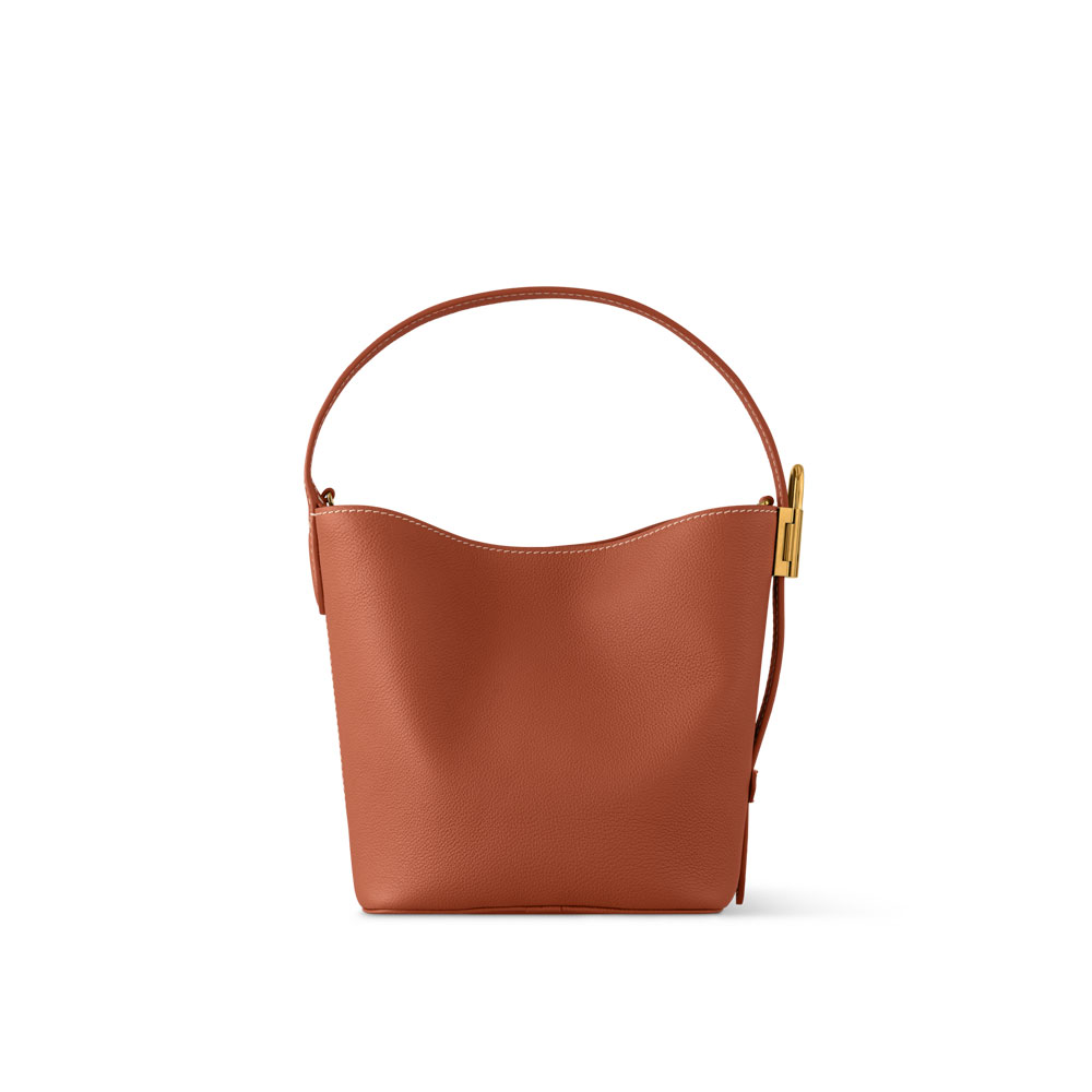 This stylish bucket bag features premium grained leather with antique gold accents for a timeless look.