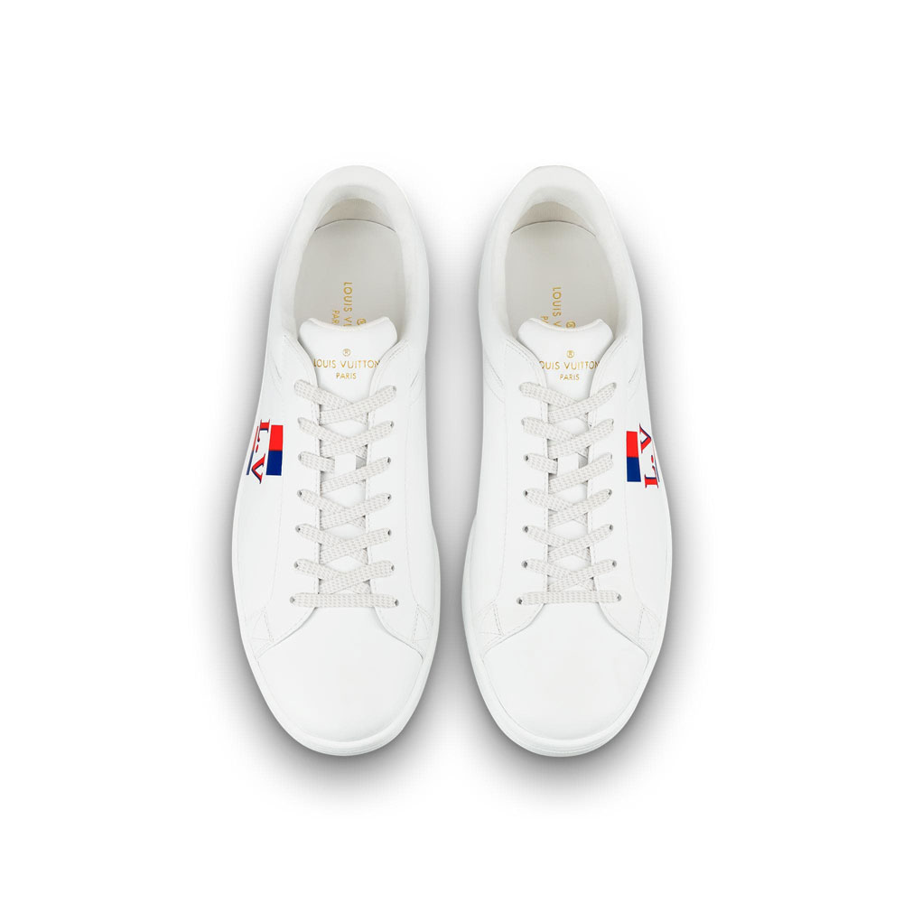 The Luxembourg sneaker in supple calf leather is characterized by its simple shape and bold colorblocking, with the rubber outsole matching the upper and laces. Available in graphic black and white, as well as bright red and blue, it is decorated with a two-tone stripe and the LV initials, inspired by Louis Vuitton's tradition of personalization.