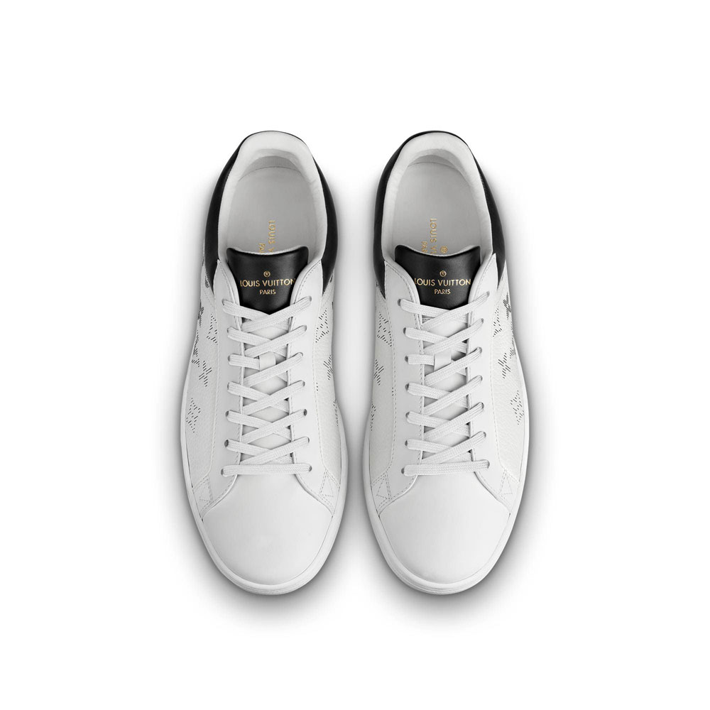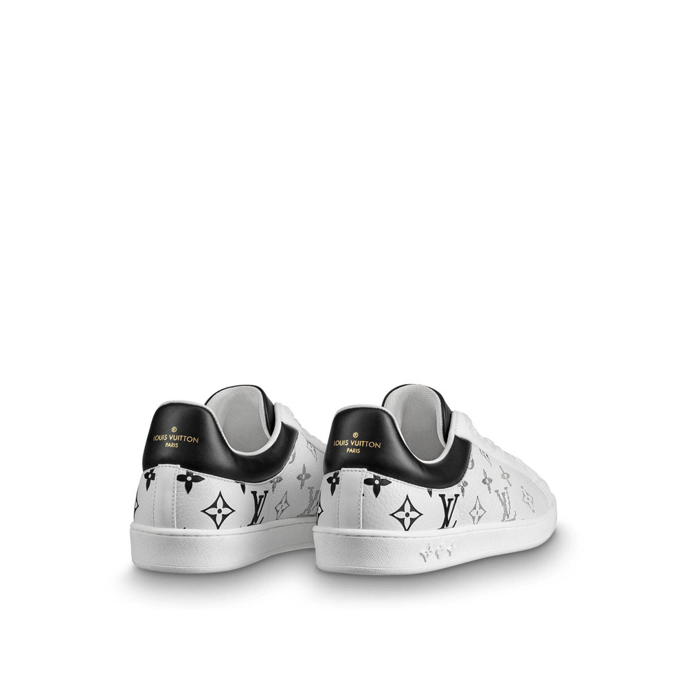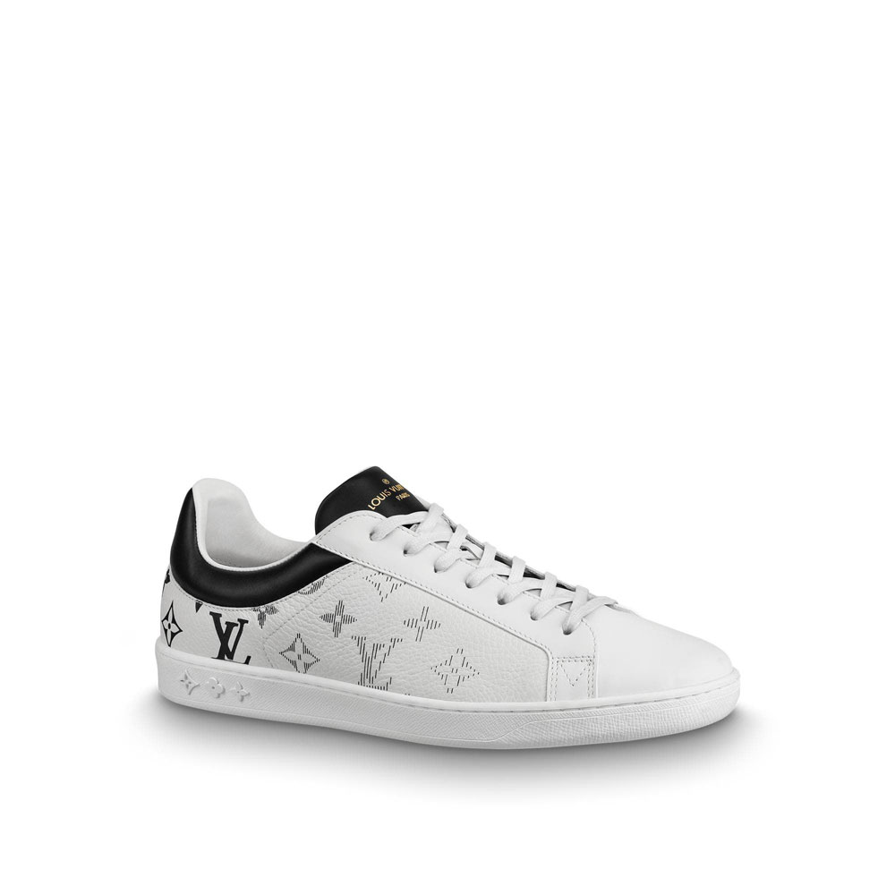 The Luxembourg sneaker comes in white grained calf leather laser-printed in color with Louis Vuitton's iconic Monogram pattern. The extremely supple leather complements the sleek design of this sneaker. which also features a color-matched collar and tongue. The white rubber outsole is debossed with a motif of Monogram Flowers.