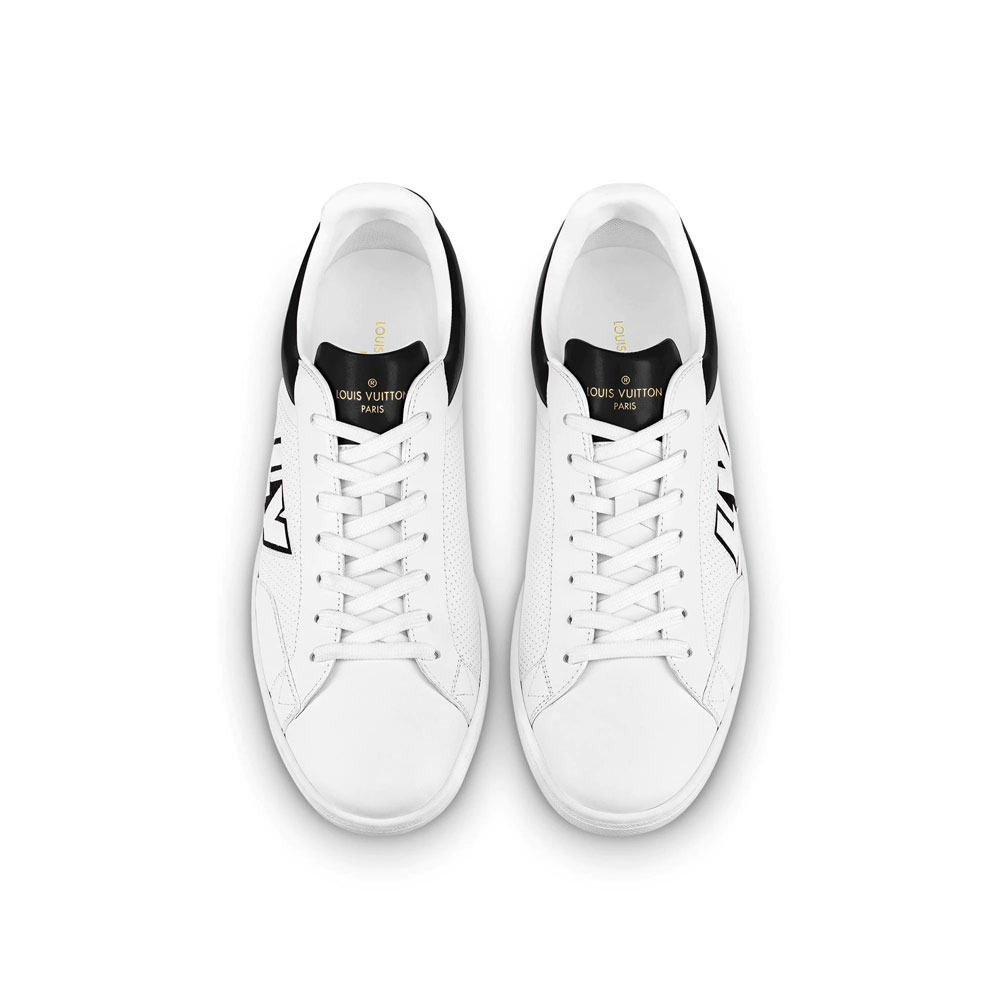 This bicolor version of the Luxembourg sneaker is crafted from exceptionally supple calf leather. both plain and perforated. The contrasting tongue and collar create a graphic look. which is complemented by the LV logo on the side. This sleek. timeless sneaker is finished with a white rubber outsole decorated with Monogram Flowers.