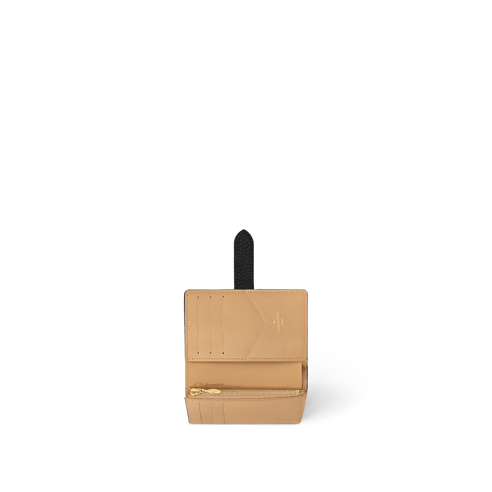 The LV Vertical compact wallet is crafted from grained Taurillon leather, which is complemented by a contrasting lining. This refined design is notable for its sliding LV Initials closure, which references the clasp of the iconic Capucines bag. Its compact format is surprisingly spacious, with features including six card slots and a zipped, gusseted coin compartment.