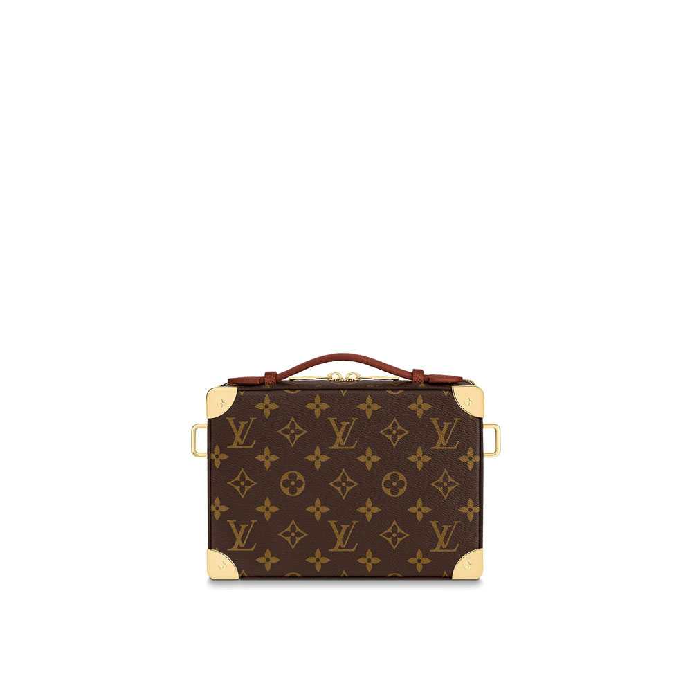 With its boxy shape. gold-color metallic corners. and rivets. the small Handle Trunk bag evokes Louis Vuitton's iconic trunks. The leather top handle brings an added vintage feel while the removable leather strap enables shoulder carry. The two zip pulls give easy access to an interior large enough for a phone and wallet.