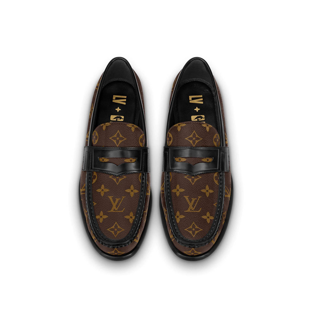 An update of the timeless penny loafer. the LV Loafer is crafted from Louis Vuitton's signature Monogram canvas with black glazed calf-leather trim. This special edition belongs to the Louis Vuitton x NBA capsule of accessories. leather goods and ready-to-wear. and features the NBA logo on its insole.