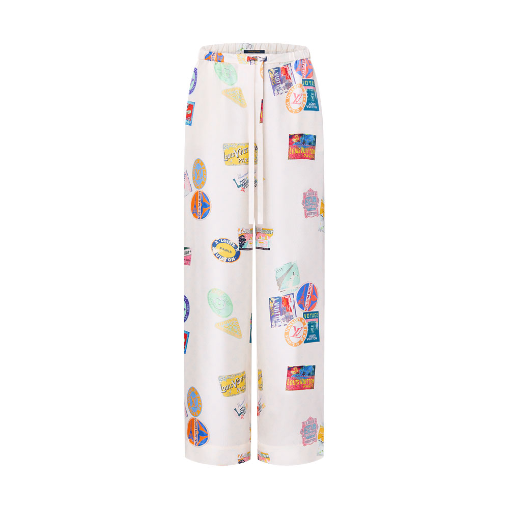 Louis Vuitton Mahina Patch Pyjama Trousers in White offer effortless elegance for lounging or casual outings. Pair these luxurious silk-blend pants with a matching Louis Vuitton cloth material camisole or a relaxed cashmere sweater for a monochromatic ensemble. Layer with a lightweight kimono-style robe in neutral tones to highlight the travel-themed embroideries.