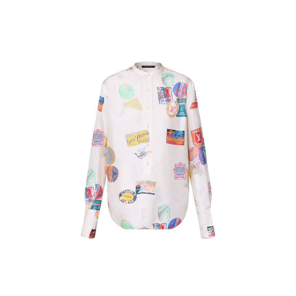 Louis Vuitton Mahina Patch Silk Shirt in White 1AHGGT effortlessly blends luxury with contemporary style. Pair this collar-free silk blouse with tailored high-waisted trousers or a sleek midi skirt to highlight its curved hemline.