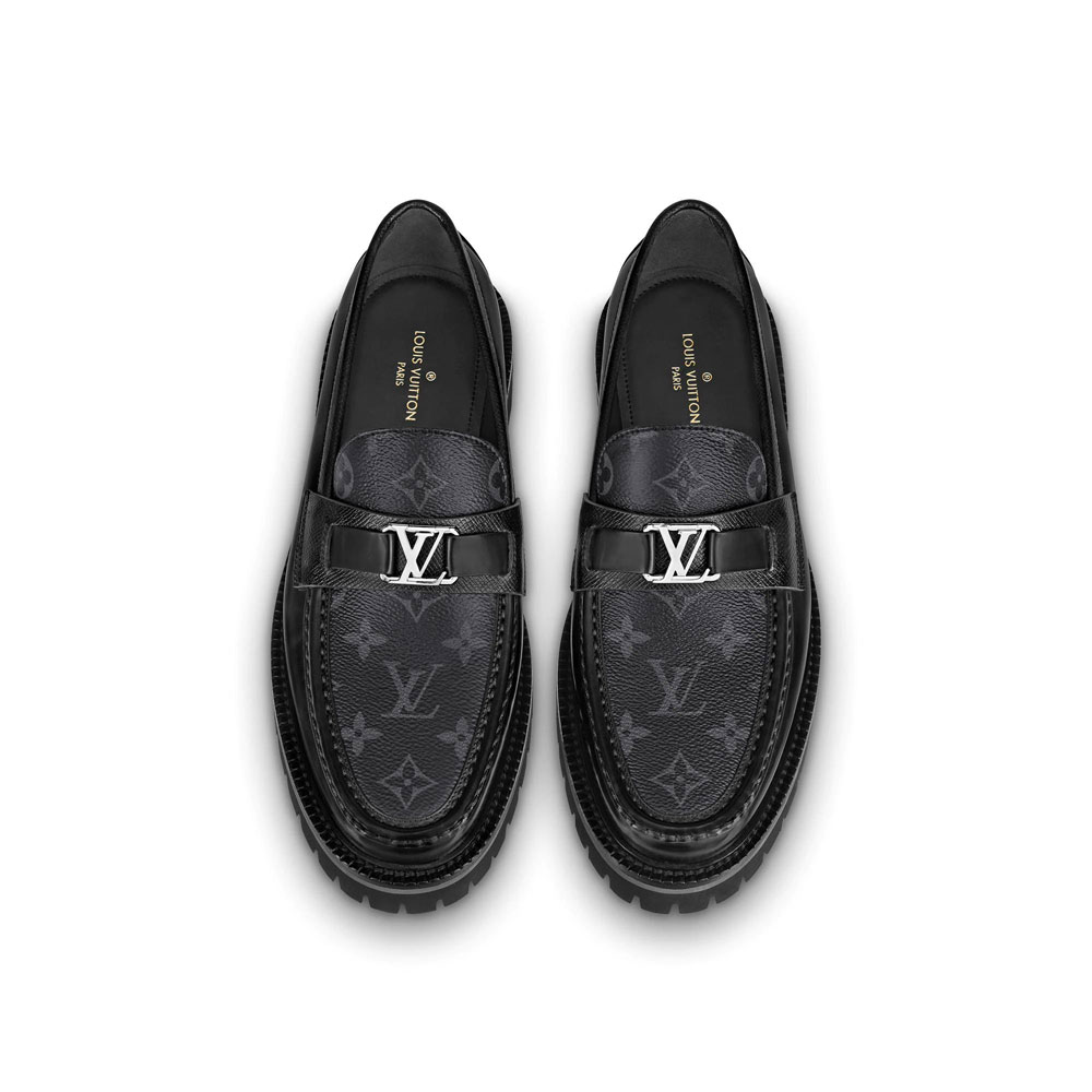 The Major loafer is revisited in glazed calf leather with coordinating Monogram-canvas trim. This timeless model is characterized by its hand-stitched vamp. which is finished with an LV Initials accessory on a Monogram-canvas strap. It has a mixed leather and rubber outsole for improved resistance to slips and wear.