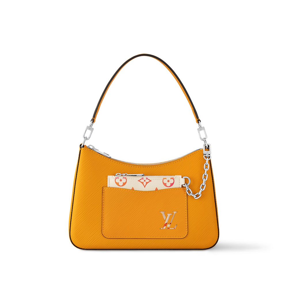 The stylish Marelle bag is fashioned from grained Epi leather and features a front outside pocket with a removable zipped pouch in Monogram Tiles canvas, hooked to the bag with a detachable chain. It has a removable top handle for hand, shoulder and elbow carry, plus an adjustable and detachable leather strap for shoulder wear.