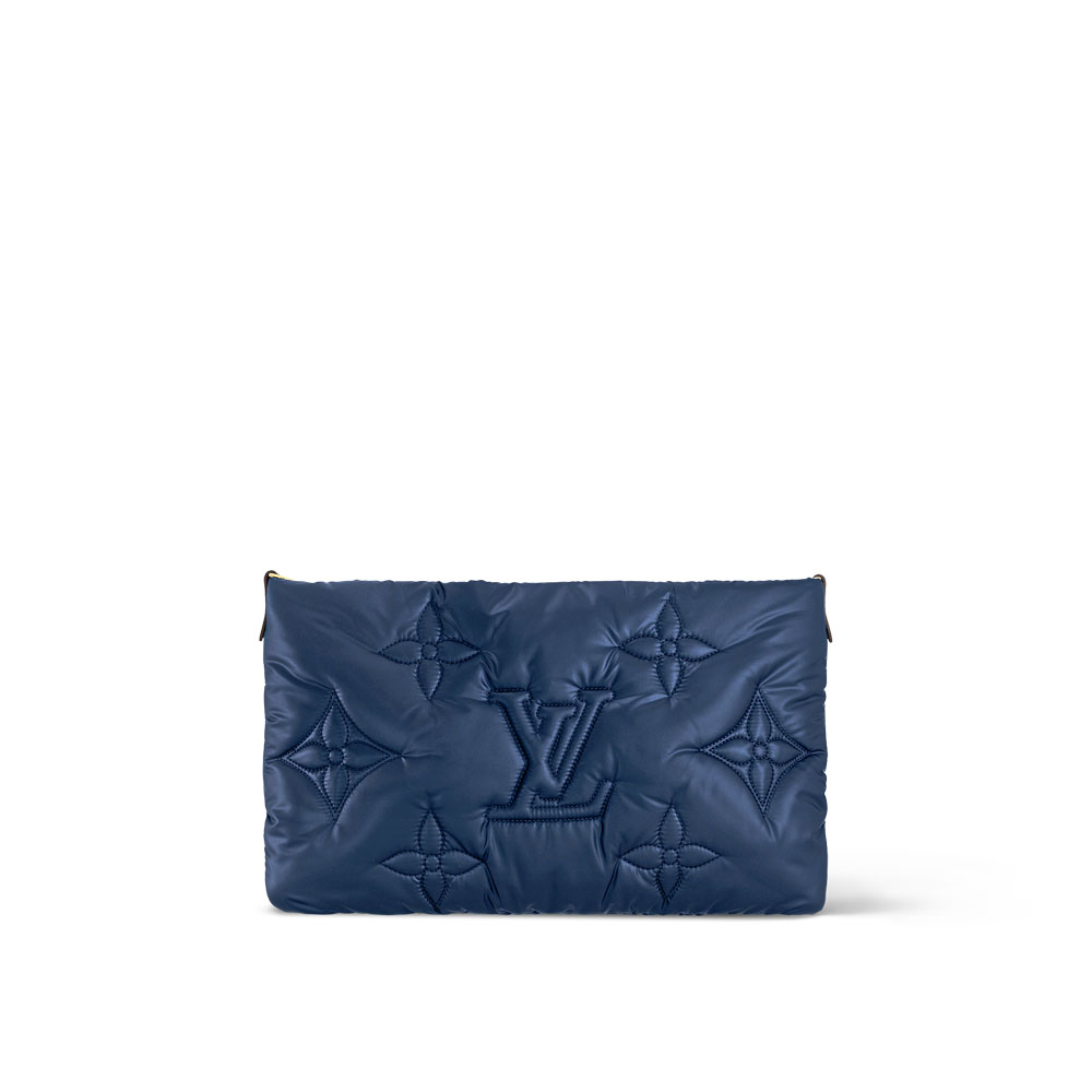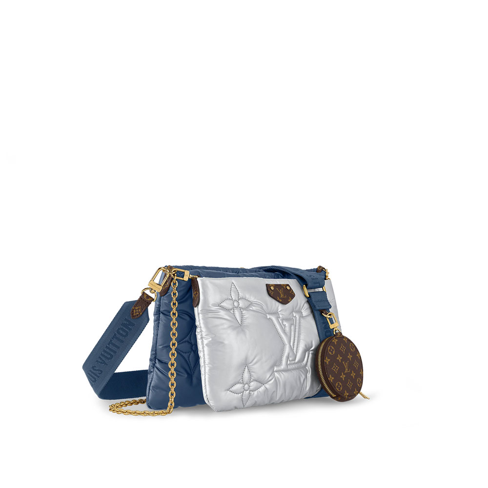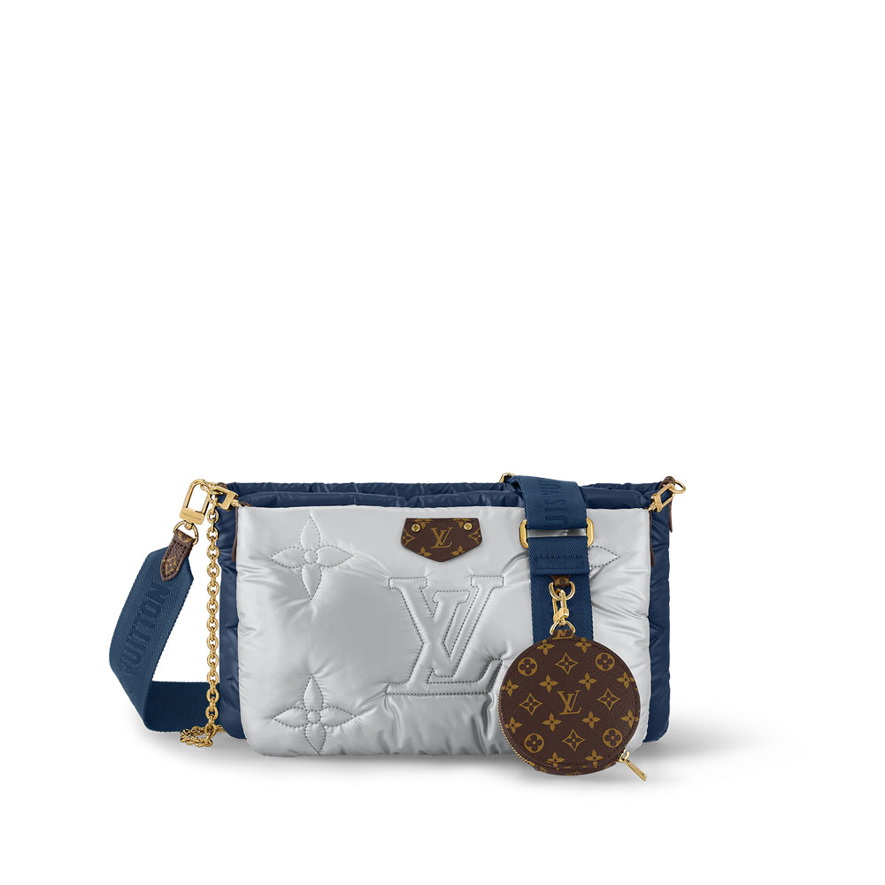 Crafted from recycled nylon in navy-blue and silver. the Maxi Multi-Pochette Accessoires belongs to the season's LV Pillow capsule. This playful piece provides so many styling opportunities: it can be worn cross-body on the long removable strap. carried as a clutch or by hand on its removable chain. with or without the cute detachable coin purse.