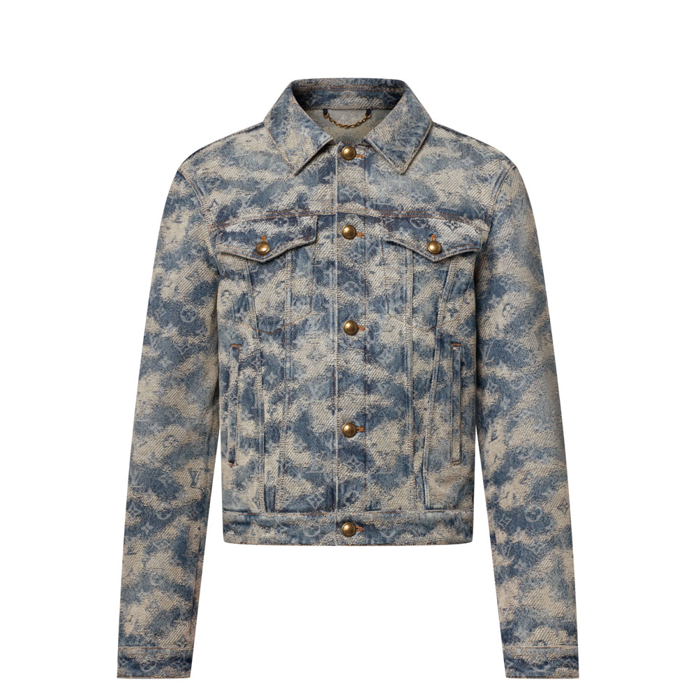 Introducing Louis Vuitton's stylish Denim Trucker Jacket featuring their iconic Monogram pattern. Inspired by England's misty countryside, this premium jacket showcases an elegant Foggy Monogram jacquard design woven into indigo cotton fabric.