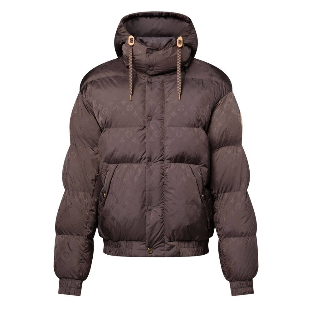 Monogram Down Blouson Explore Louis Vuitton's Monogram Down Blouson: This stylish dark brown jacket blends warmth and urban sophistication. Featuring Ecodown filling for insulation, its technical jacquard fabric showcases subtle Monogram prints. The flattering silhouette combines practical elements with refined details like Damier-inspired leather accents. Perfect for city life or winter outings.