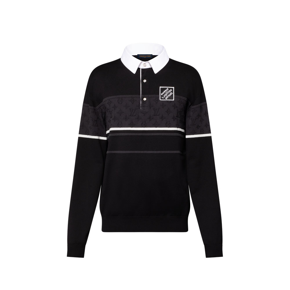 This sleek black long-sleeved polo, crafted from Louis Vuitton's premium cloth material, pairs effortlessly with tailored trousers or dark denim for a smart-casual look. Layer it under a minimalist bomber jacket or unstructured blazer to highlight its 3D textured stripes and pearlized fastenings.