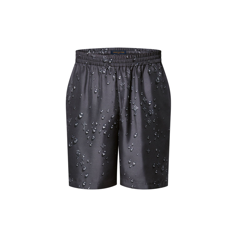 Monogram Silk Shorts for Men Experience luxury with Louis Vuitton's Monogram Silk Shorts. Made from smooth silk twill, these obsidian shorts feature a relaxed fit and elastic waistband for ultimate comfort. The playful Monogram Waterdrops print recreates the iconic LV pattern as artistic raindrops, inspired by British countryside weather. Pair them with the matching short-sleeve shirt for a sophisticated resort look.