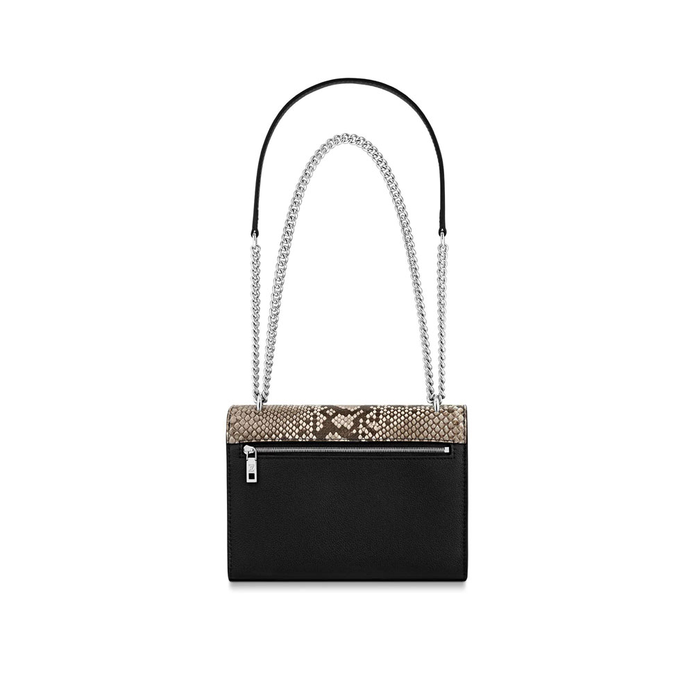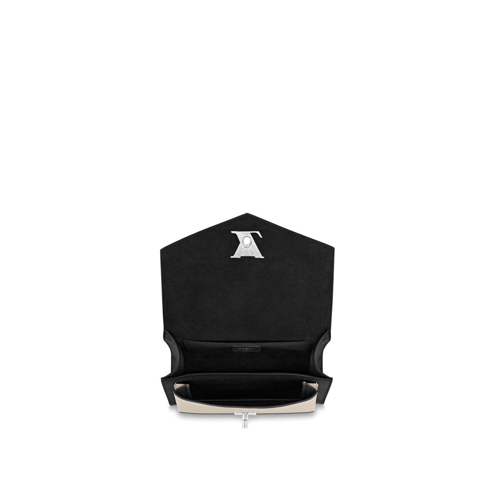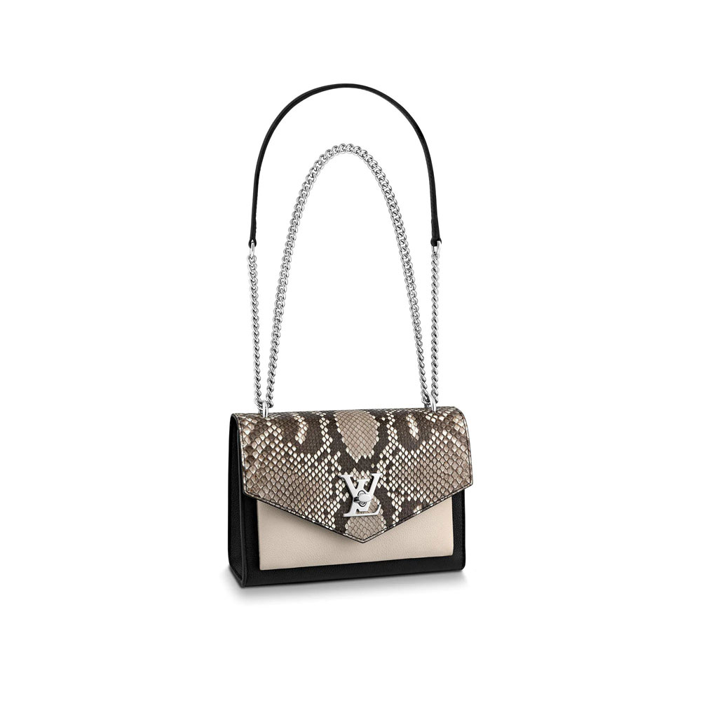 The elegant Mylockme BB handbag comes in black and cream grained calf leather with a flap in natural roccia python. The envelope-style flap. Which is a key detail of the Mylockme line. Is secured with an LV Turn lock. This bag features an adjustable strap for shoulder or cross-body carry.