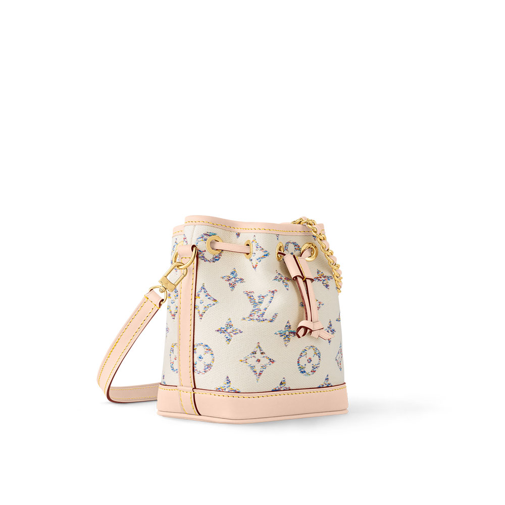 This exclusive edition of the Nano Noe bag is crafted from Monogram jacquard fabric with a tweed-like appearance. A mini replica of the iconic Noe bag, this model is complemented by a natural leather trim on its base, drawstring closure and removable, adjustable shoulder strap. Its handle, which is also removable, is a laced, gold-tone chain.