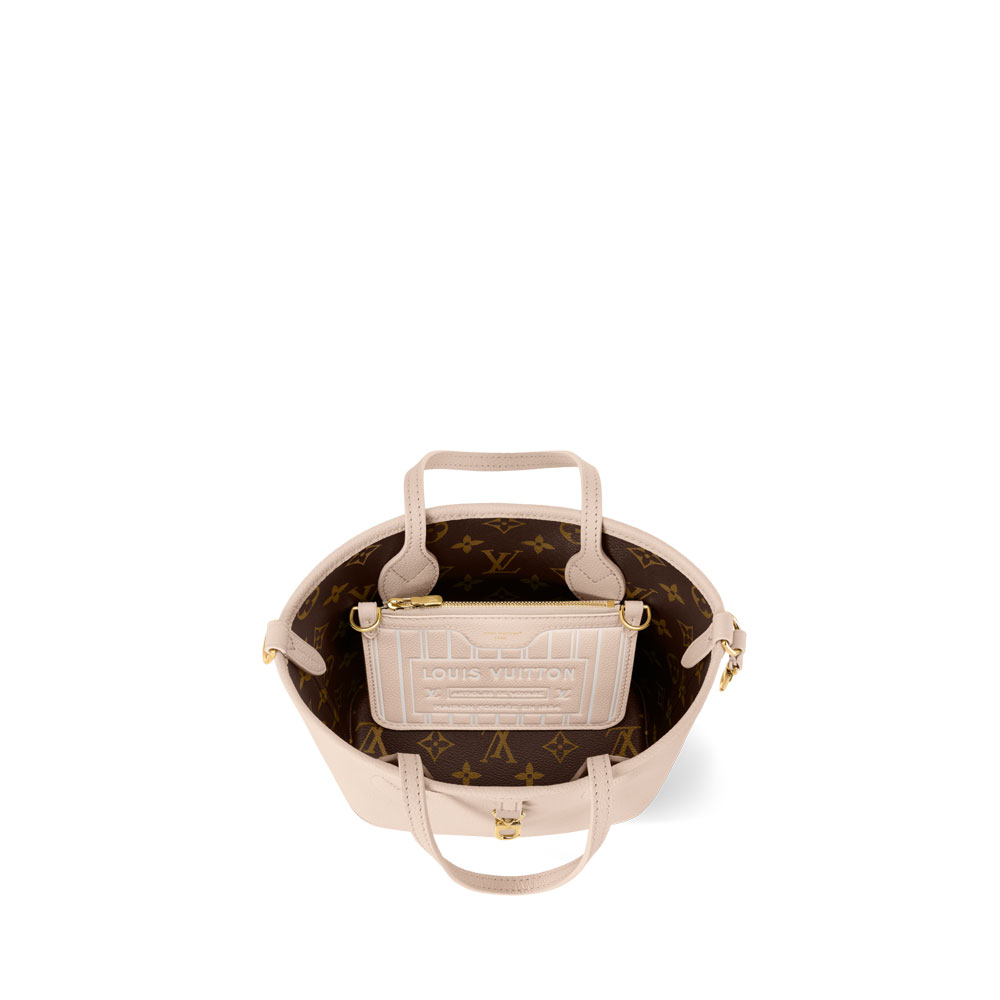 This special edition Louis Vuitton Neverfull BB tote offers dual-side versatility. Wear it with premium Limestone leather facing outward or reverse to display the iconic Monogram canvas. The bag includes a detachable zippered pouch that doubles as an exterior pocket. Shiny gold accents complete the sophisticated design.