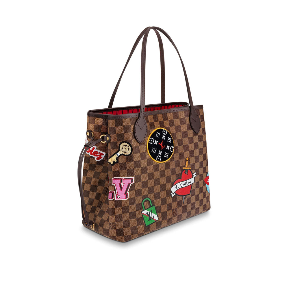 Louis Vuittons Neverfull MM handbag explores the Houses travel legacy with its modern take on vintage luggage �stickers". A combination of smooth leather and Damier Ebene canvas with printed and embroidered patches create a playful feel. The bags side-leather laces and snap-hook closing keep essentials secure inside.