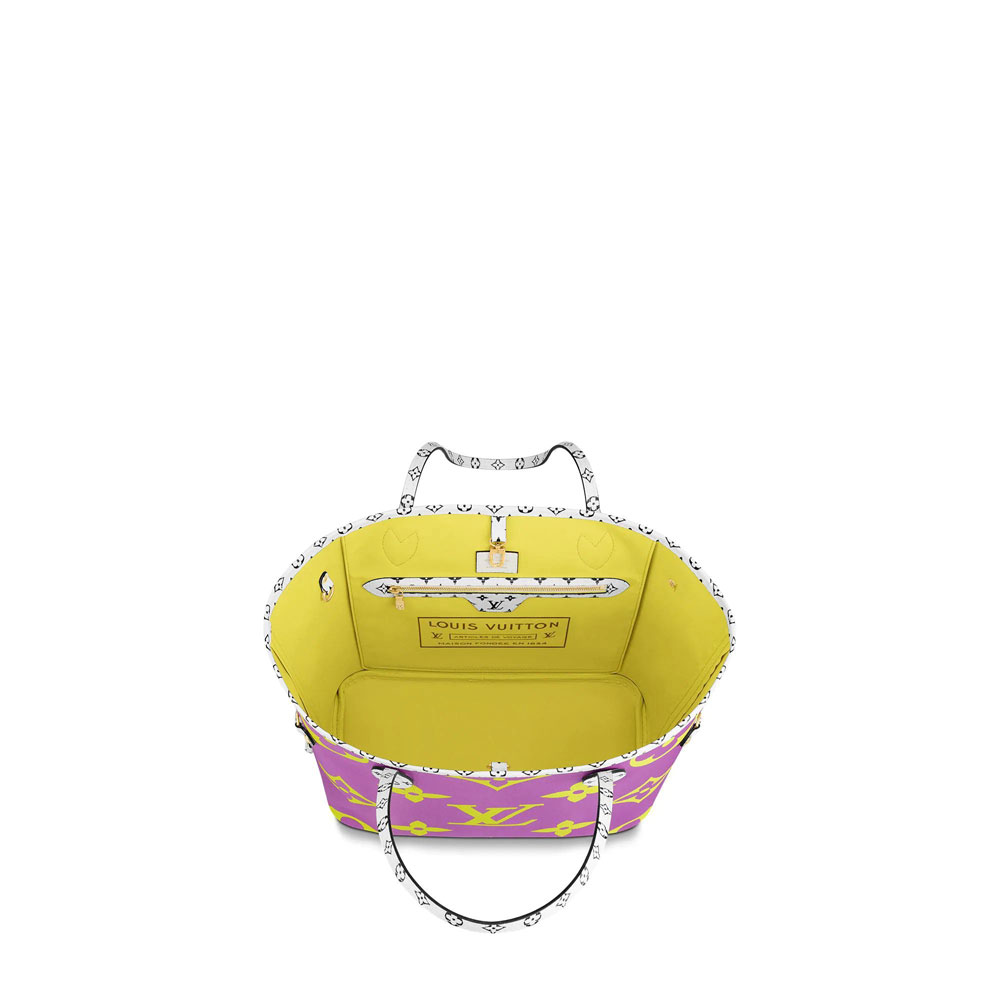 Playful. colorful. Neverfull this season the iconic carryall wears a bold new spin on Monogram canvas. XL and Mini versions of the signature motif combine in sunny color palettes for a fun. summery look. Worn over the shoulder or carried on the arm. this MM model pairs perfectly with both beach and city looks.