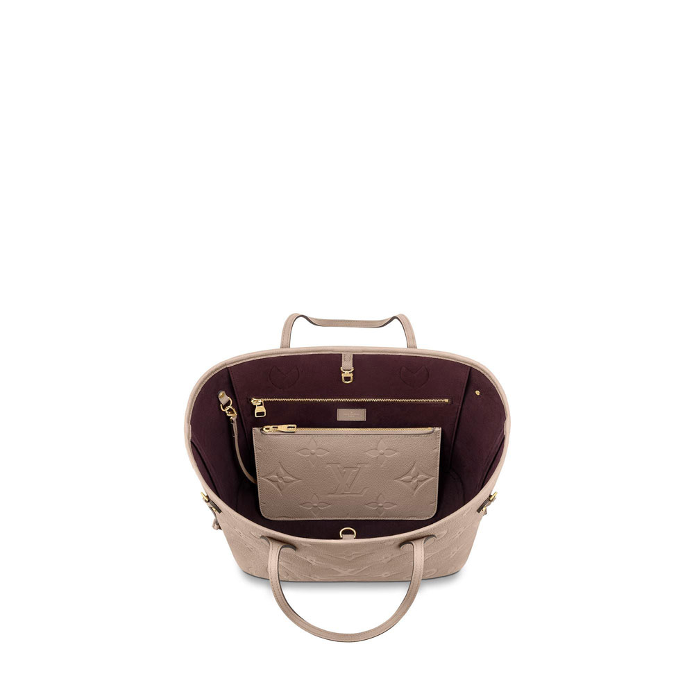 The essential Neverfull MM tote now comes in embossed Monogram Empreinte leather. Its generous dimensions make this bag ideal for everyday use while the long shoulder handles and supple leather mean it's comfortable to carry. With the side laces cinched. this roomy carryall becomes a stylish city bag. It can be worn over the shoulder or on the elbow.