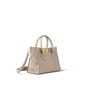 The On My Side PM tote bag is made from calf leather in a soft gray colorway. with sides in Mahina calf leather and its perforated Monogram pattern. Functional. this tote has two outside pockets for quick access to essentials. Two top handles and a removable strap enable shoulder or cross-body carry.