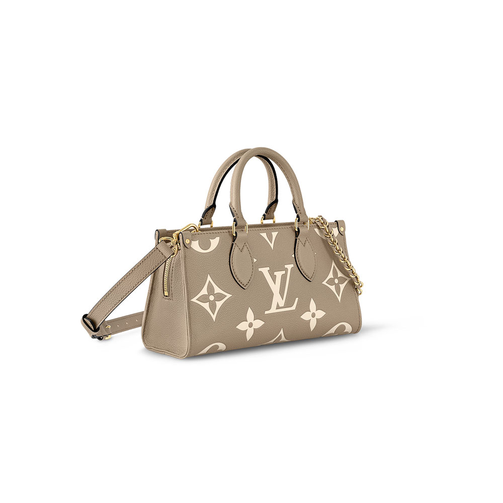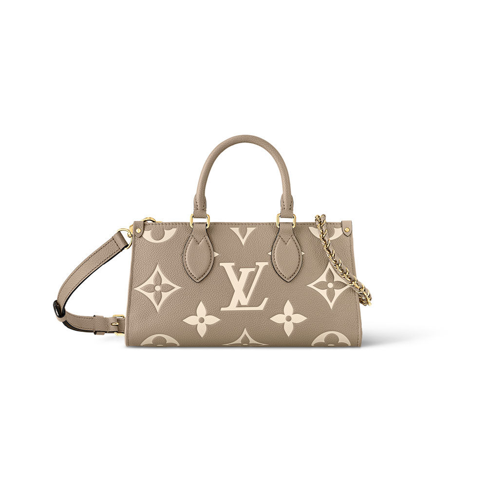 Louis Vuitton OnTheGo East West: Introducing the OnTheGo East West tote. interpreted in a beautifully proportioned east-west silhouette. Made from Monogram Empreinte leather embossed with a tonal Giant Monogram motif. this compact model boasts a well-organized interior for daily essentials. The bag lends itself to a variety of carry styles. thanks to its two articulated top handles and a removable chain-and-leather strap.