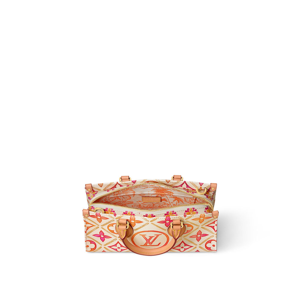 Its striking, stretched shape and Monogram Tiles canvas make this OnTheGo East West handbag one of the stars of the LV By The Pool Collection. The irregular pastel treatment of the LV Circle and Monogram Flowers conjure dreams of faraway shores. A wide, detachable strap means it can be styled in a variety of ways.