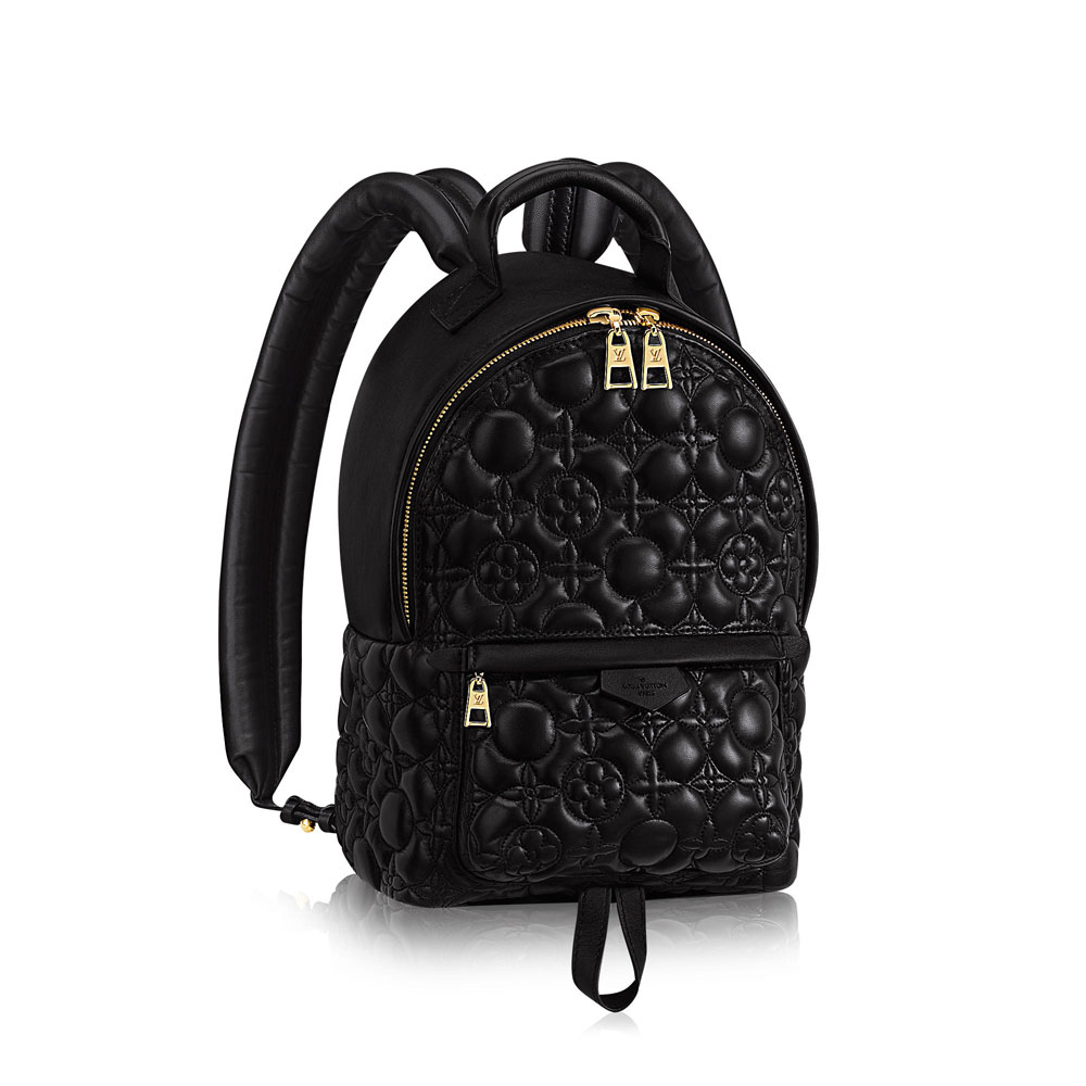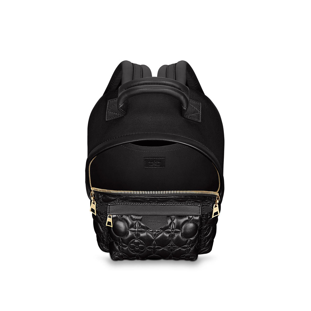 The Palm Springs PM backpack gets a sophisticated new look thanks to Louis Vuittons feminine Matelasse Flower pattern: this delicate embroidery subtly reproduces the iconic Monogram flower on the bags ultra-soft black lambskin for a lightly quilted effect.
