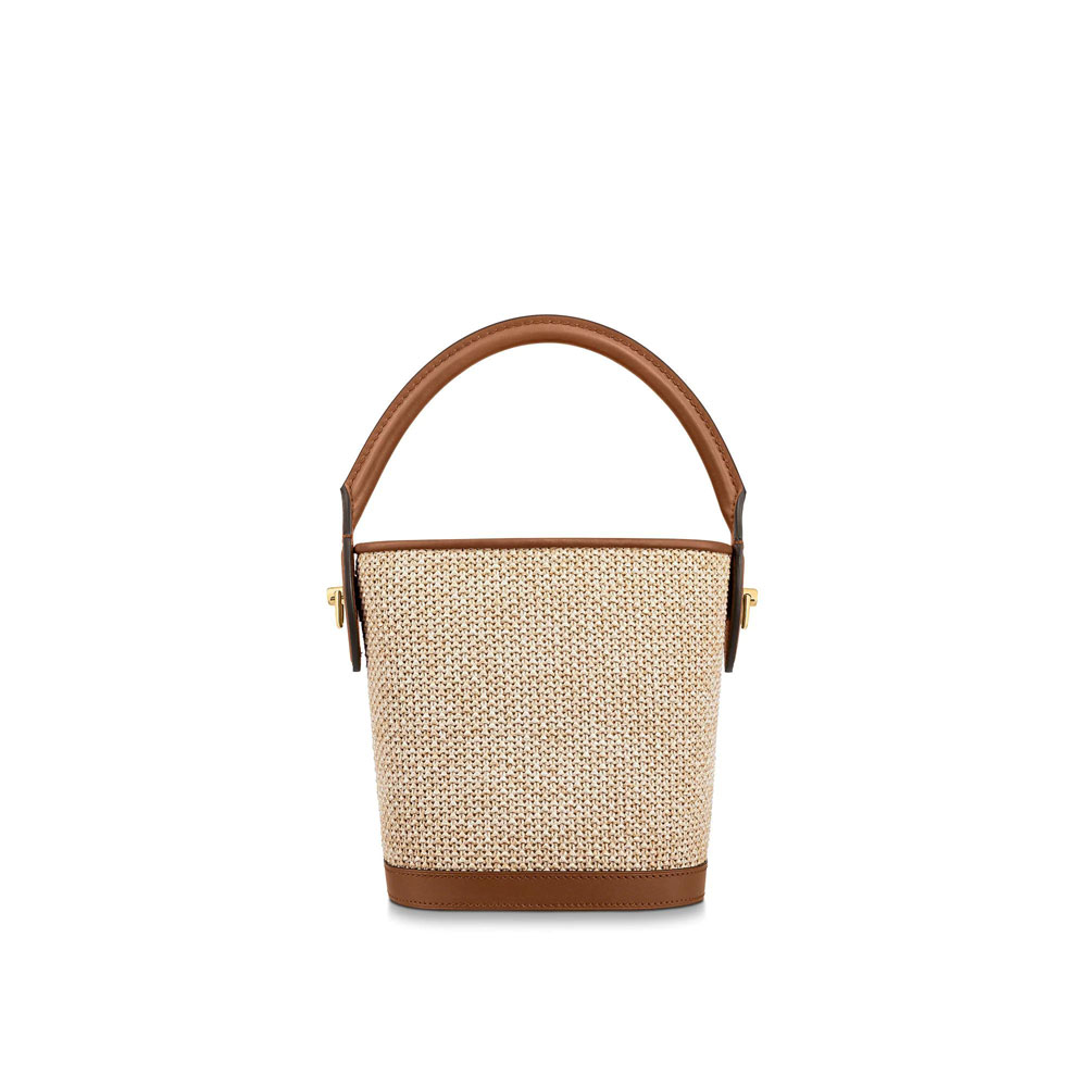 As fresh as a Spring breeze. the Petit Bucket bag is crafted from knitted raffia enriched with elegant leather detailing. The bag features the iconic LV logo patch. while the leather bottom is stamped with the Maison's golden signature. Easy to wear. with room for one's daily essentials. this feminine piece goes easily from city to beach.
