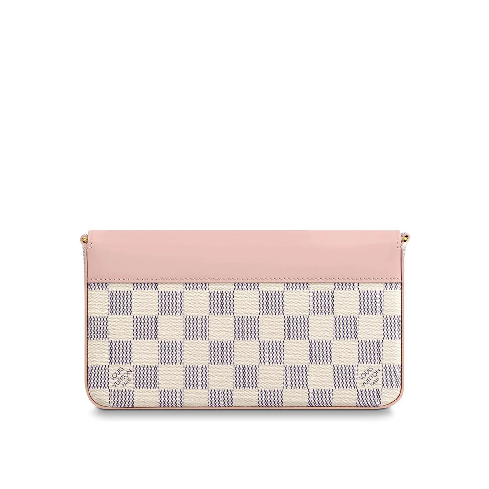 The Pochette Flicie teams Damier Azur canvas with smooth leather in pastel-pink Eau de Rose for a fresh. summery look. This versatile design can be carried either as a clutch or a small shoulder bag. The Flicie contains two removable pockets one with a zipper. the other with several credit-card slots.