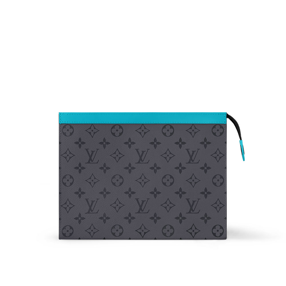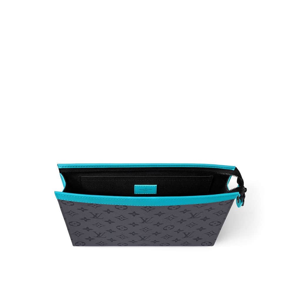 This Pochette Voyage MM is made from Monogram Eclipse Reverse canvas, paired with turquoise-color leather trim and matte-black hardware. This convenient pouch can be carried as a clutch portfolio or used inside a travel bag to keep items organized. The textile-lined interior includes six card slots and a flat pocket.