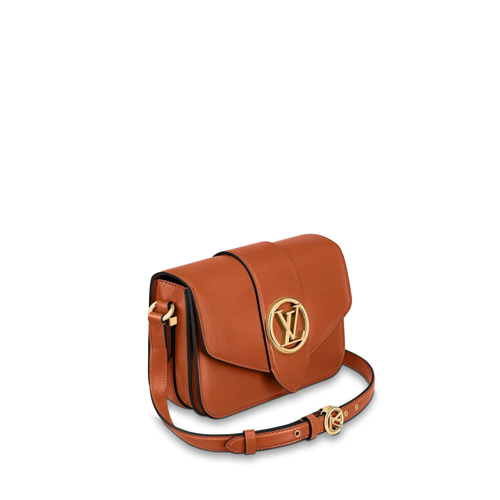 The structured yet curved lines of the LV Pont 9 handbag are fashioned from smooth leather. The LV Circle. a classic House signature reinterpreted by Nicolas Ghesquie`re. adorns the bag's flap and the adjustable strap's buckle. Hidden features such as a colored leather lining and Monogram Flower magnetic closure on the flap's underside bring subtle sophistication.