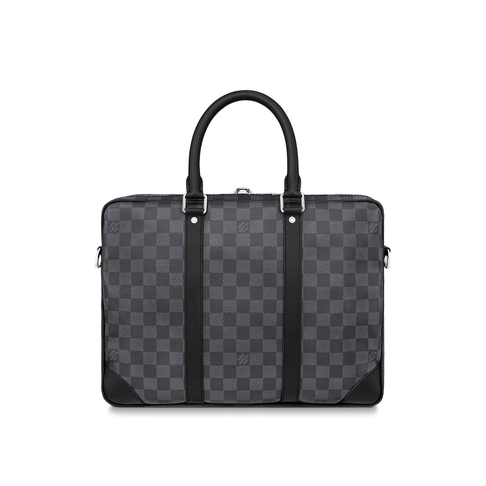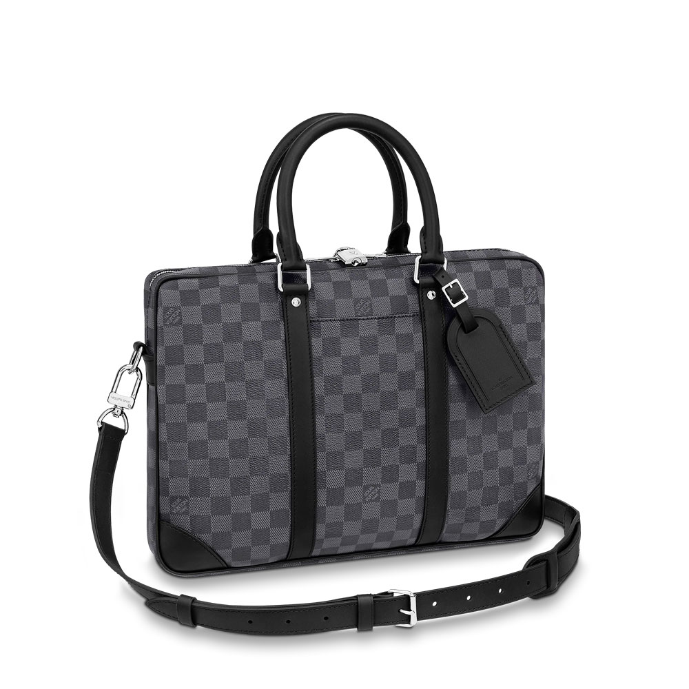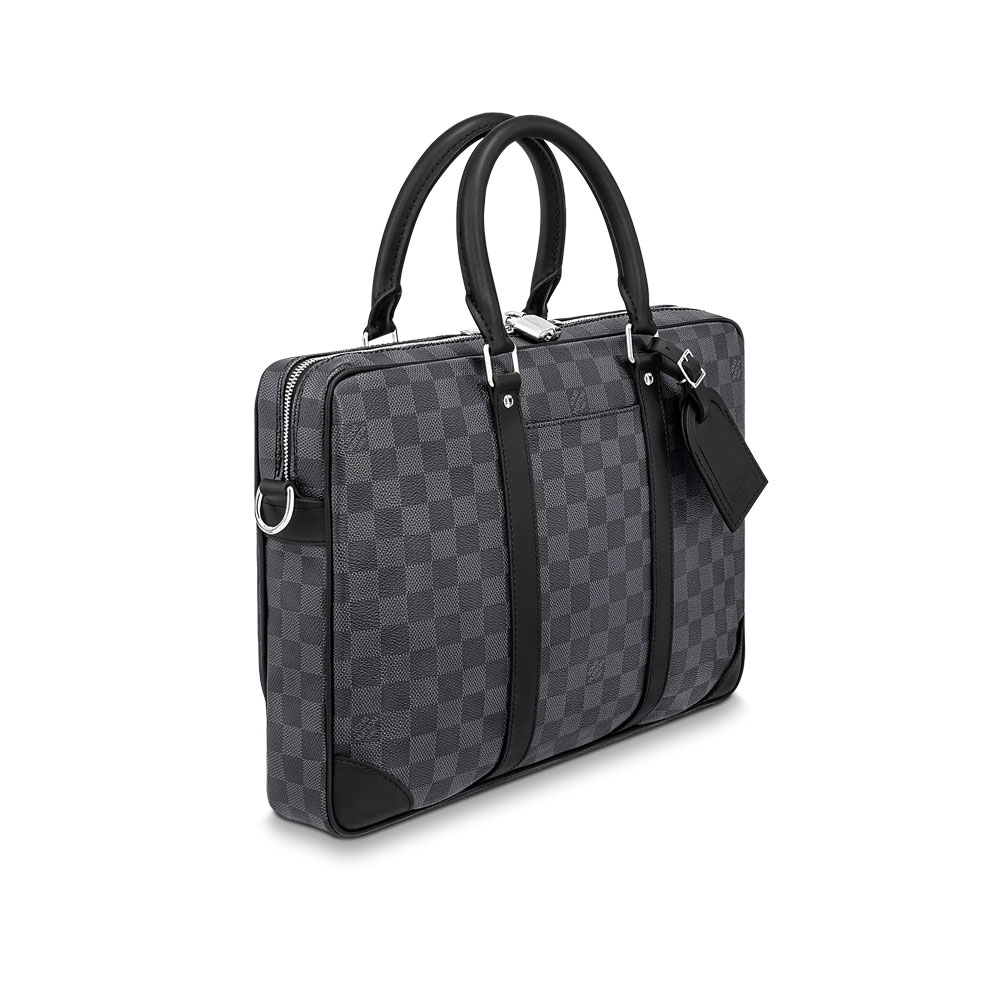 The Porte-Documents Voyage PM briefcase is made from Damier Graphite coated canvas with black-leather side bands. reinforced corners. top handles. and name tag. There's an outside pocket for a smart phone and a padded interior compartment large enough for a 13-inch laptop. The removable and adjustable strap enables shoulder carry.