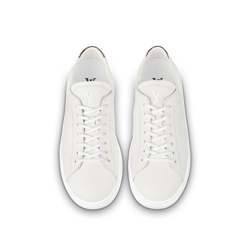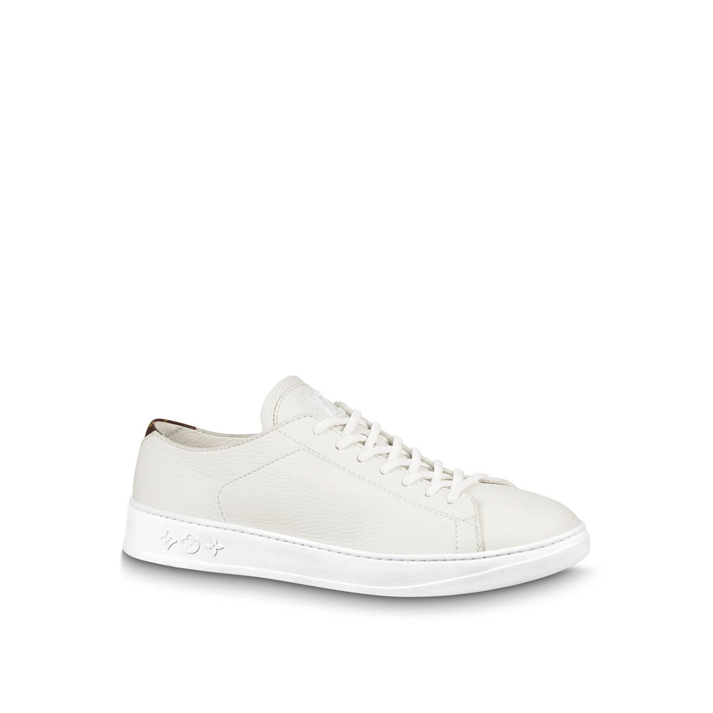 The LV Resort sneaker in supple. grained calf leather is an ideal alternative to a formal shoe. Its understated design is complemented by discreet signatures. including the LV Initials in tonal rubber on the tongue. Monogram Flowers on the white rubber outsole and Monogram-canvas trim on the back. This model features elastic laces. making it easy to slip on and off.