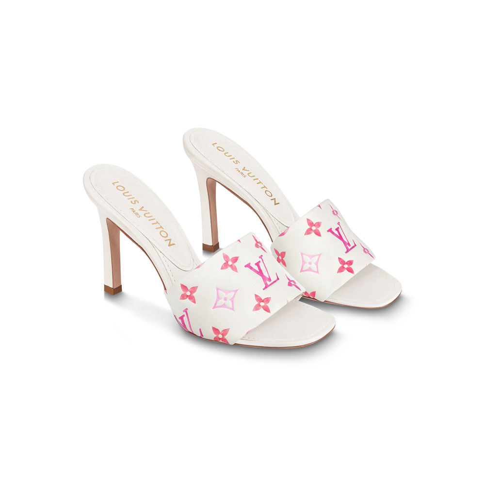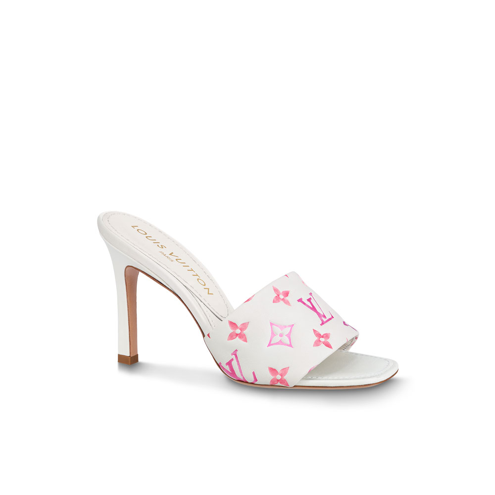 This seasonal edition of the Revival mule is crafted from extremely soft lambskin. Its wide front strap is debossed with the Monogram pattern in a gradation of summery shades coordinating with the leather goods collection. This model is finished with an elegant high heel and a fine leather outsole.
